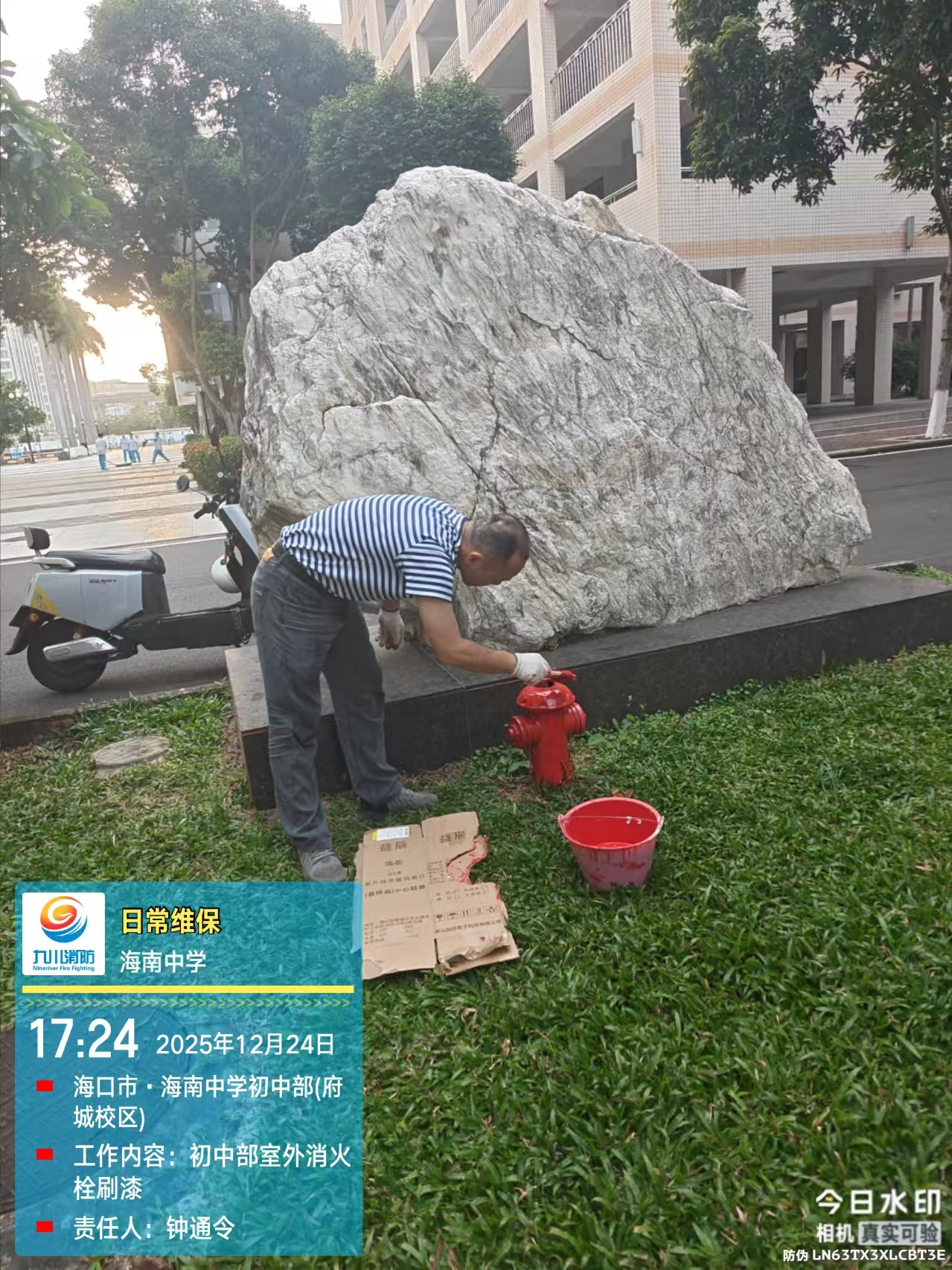 在初中部草坪旁,维保人员正俯身对消防栓进行刷漆养护。红色的油漆桶、铺垫的防护纸板、专注的操作姿态,构成了校园里一道独特的 “安全风景线”。维保团队坚持 “一栓一检” 标准,确保每处设施都达到最佳防护状态。