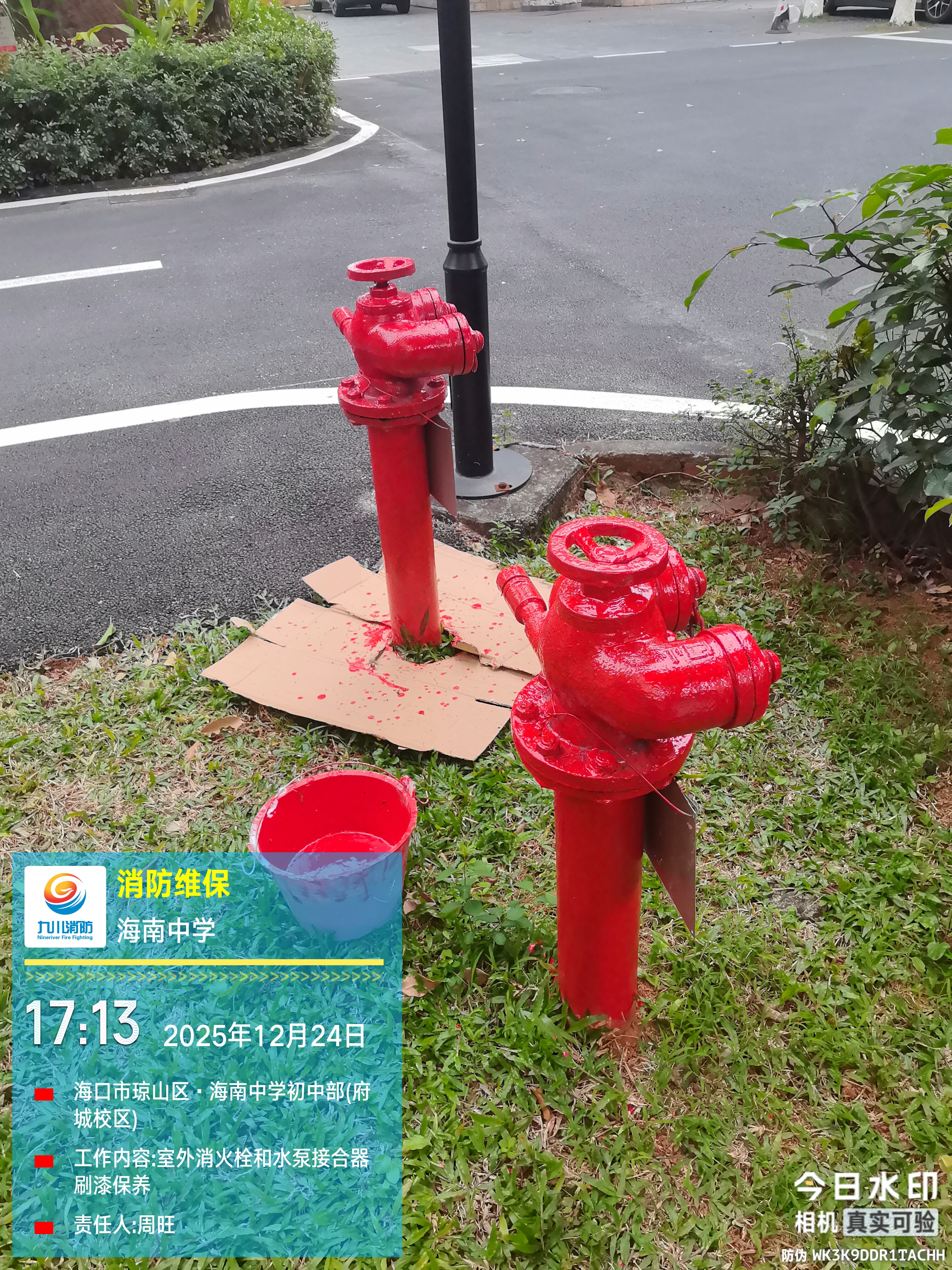 校园安全是教育工作的生命线,而消防设施则是这条生命线上的重要屏障。12月24日,九川消防维保团队在海南中学(府城校区)对初中部、高中部室外消防设施开展系统性刷漆保养工作。